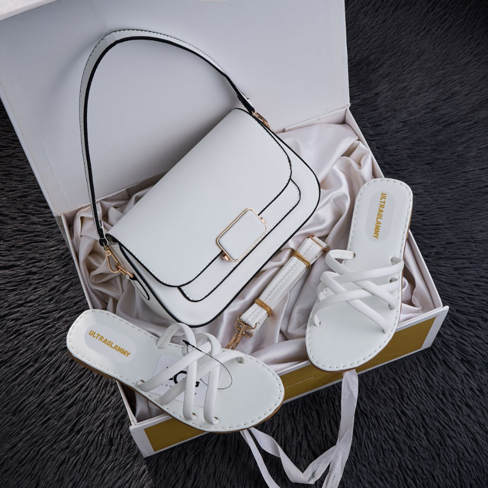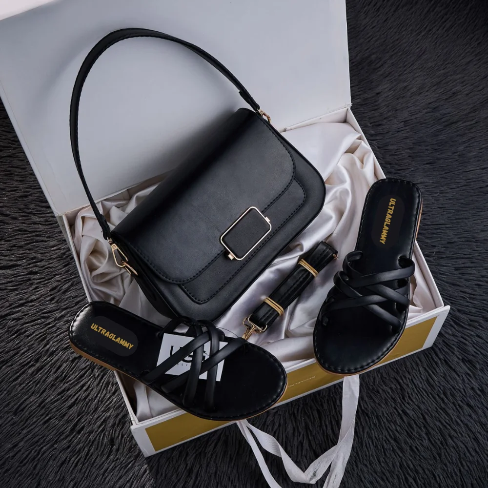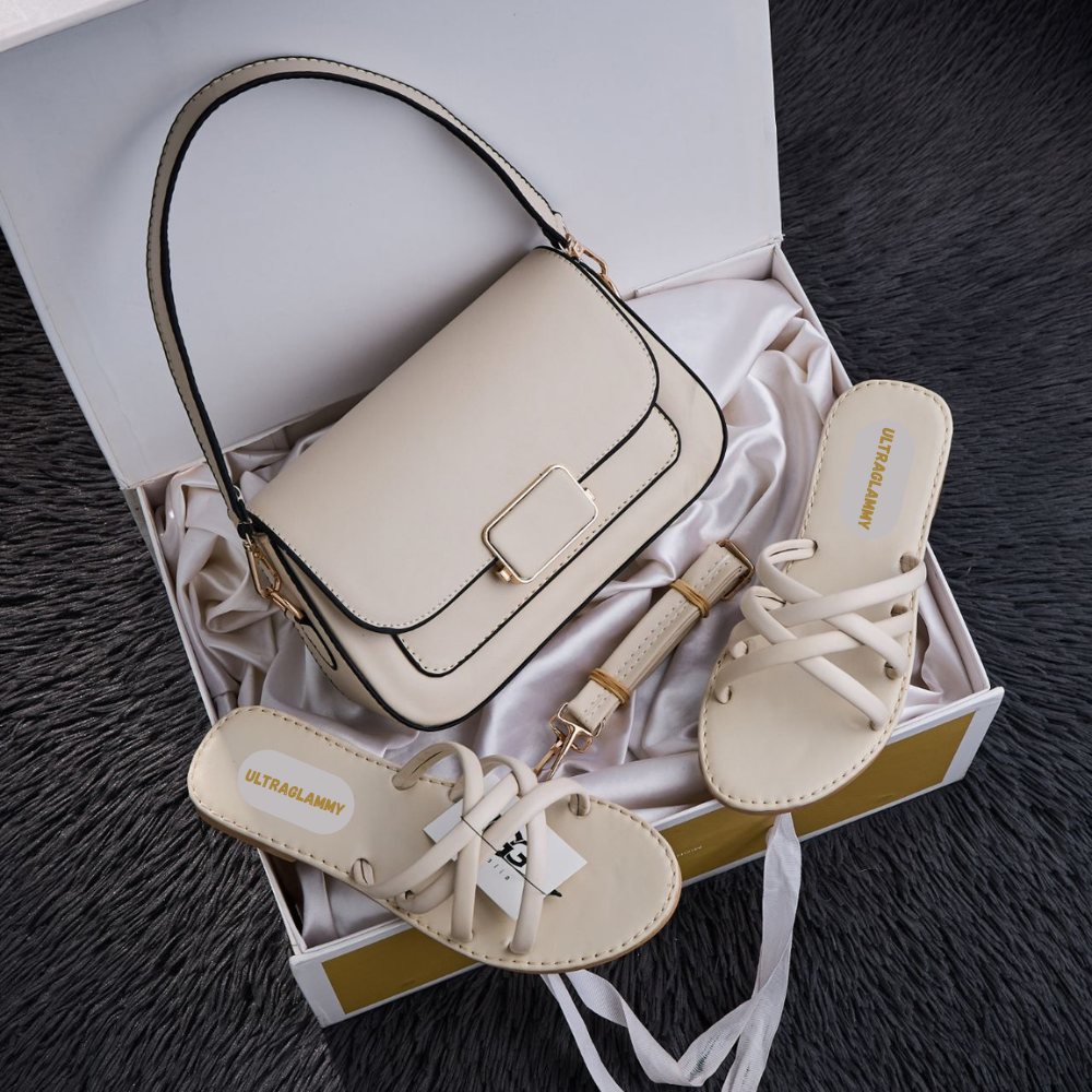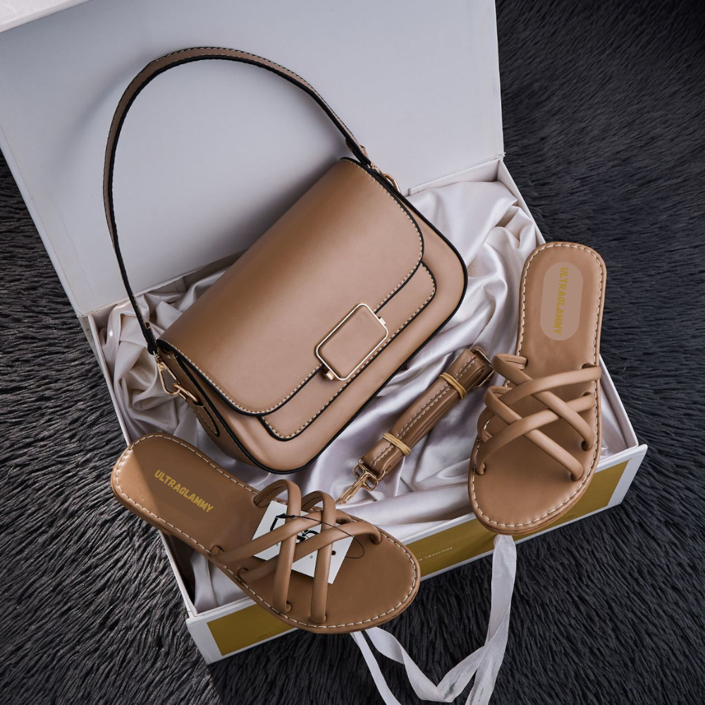 طقم مكون من حقيبة يد راقية وصندالة مريحة بتصميم عصري وجديد.